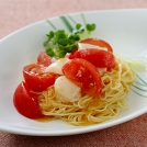 カッペリーニ(極細のパスタ)をゆでて冷水でしめ、トマトやほたてなどを合わせて冷やしたソースと和えました。