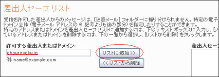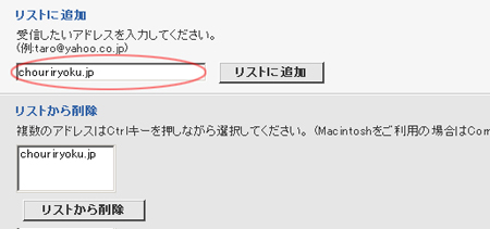 - 4.受信したいアドレスの入力欄に「chouriryoku.jp」を入力し、リストに追加ボタンをクリックしてください