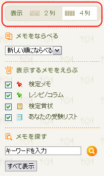 調理力ノートに表示するメモや賞状の一覧の表示を変更することができます。