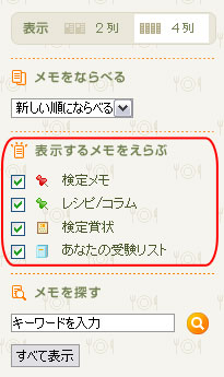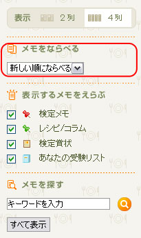 調理力ノートに表示するメモや賞状の一覧を条件を指定して並び替えることができます。