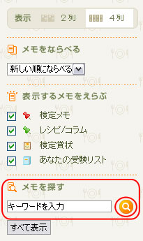 検査キーワードを入力し、メモの中から条件にあったメモを検索します。