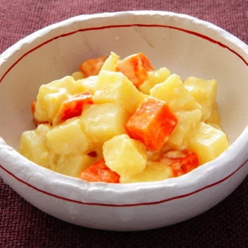 - なべに湯を沸かし1を入れてさっと火を通した後、冷水にさらし水けをきる。ボウルにじゃが芋を入れ、混ぜ合わせたAを加えて和える。