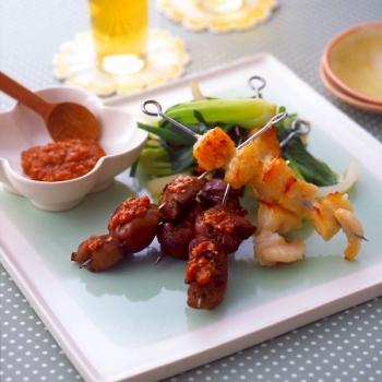 - レバーは水でよく洗って、水にしばらく浸して血抜きをする。水けをふき、大きいものはひと口大に切ってグリルで焼く。