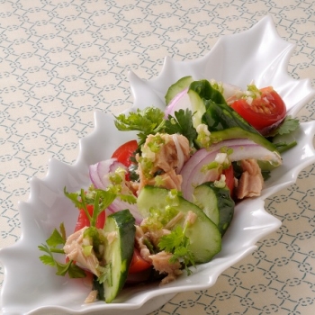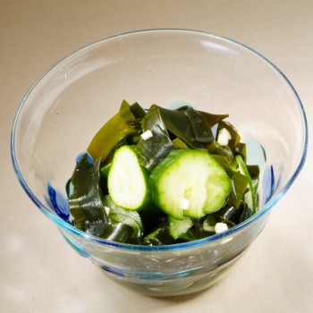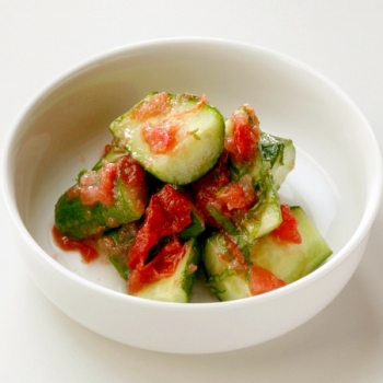 焼いたささ身の香ばしさ、水菜ときゅうりの歯ごたえ、梅干の酸味でいただきます。