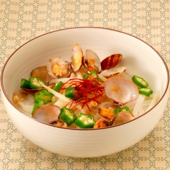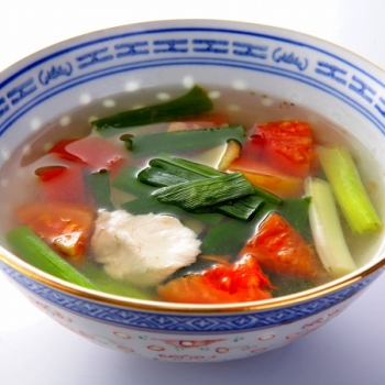 - しょうが、ねぎ(葉)を取り除き、トマト、塩を加えひと煮立ちさせ、2の蒸し汁も加える。