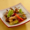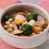 素揚げしためざしときのこ、野菜を南蛮酢に漬けてさっぱりいただきます。熱いうちに漬け込むことで、早く味がなじみます。 - ブロッコリーと大豆のハーブスープ煮