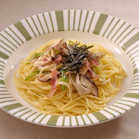 きのこをたっぷり使った、和風スパゲッティです。きのこの香りやベーコンのコクに減塩だしつゆを合わせ、奥行きのある味わいに。たっぷりのきのこで食べごたえが増し、満足感もしっかり得られます。